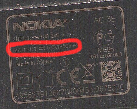 Según las especificaciones de la conexión USB (Universal Serial Bus), la tensión de alimentación debe estar entre 4,75V y 5,25V. Para comprobar la tensión nominal del cargador, habrá que mirar en la etiqueta que debe tener con las características. En mi caso, he utilizado un cargador de Nokia, que da 5V/350mA.