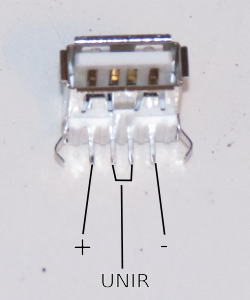 Actualización del 18-03-2014: Después de tener el cargador montado y probarlo con varios dispositivos, me di cuenta de que con algunos no funcionaba. En la página de Wikipedia en inglés, encontré que algunos dispositivos necesitan que los dos pines centrales del conector, el D+ y D-, estén conectados entre sí, es decir cortocircuitados. Por lo tanto, en este punto deberéis unir los 2 pines para forzar a cargar cualquier dispositivo que conectéis al cargador.