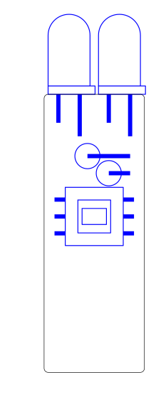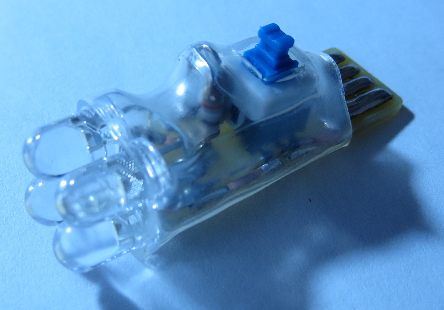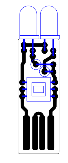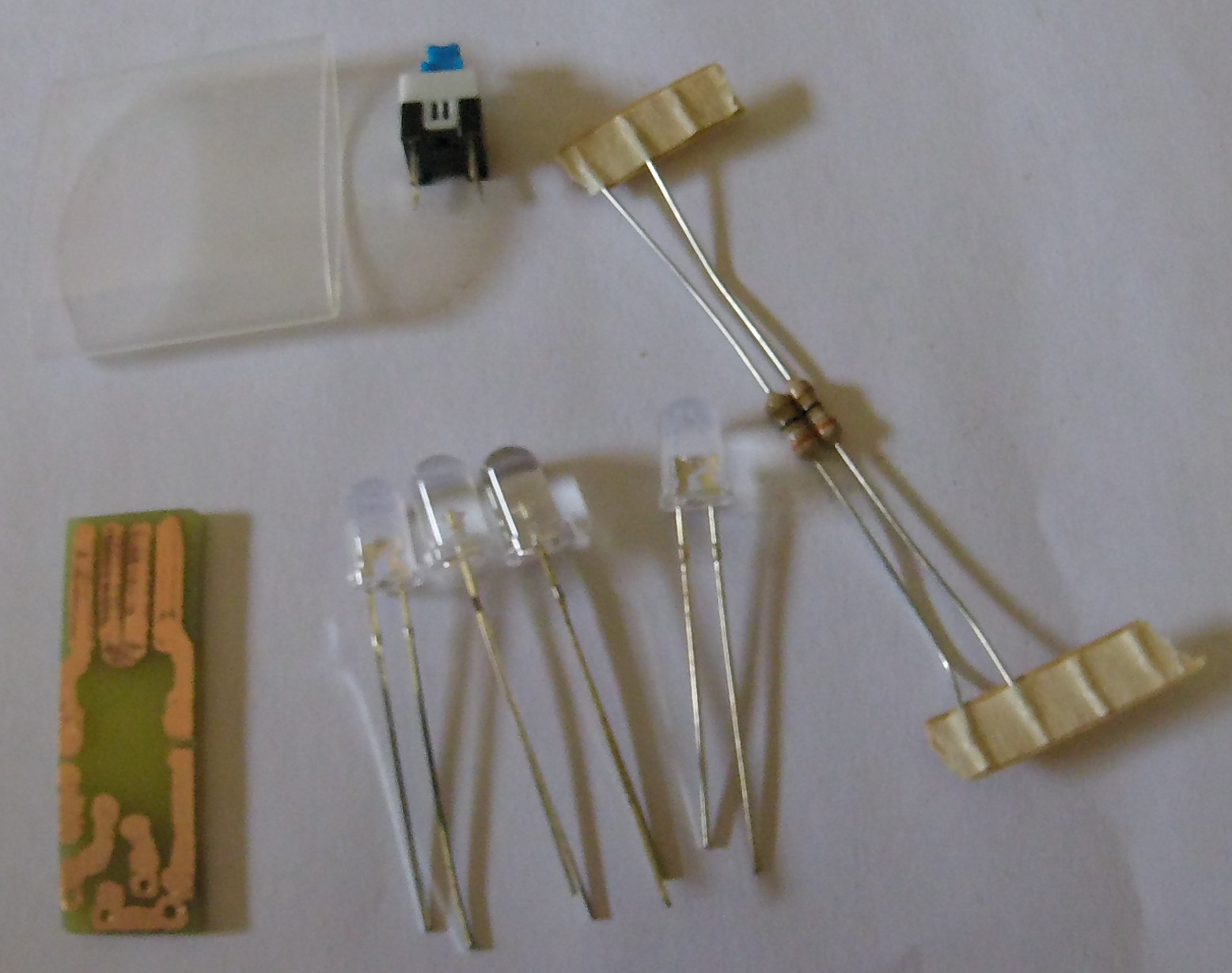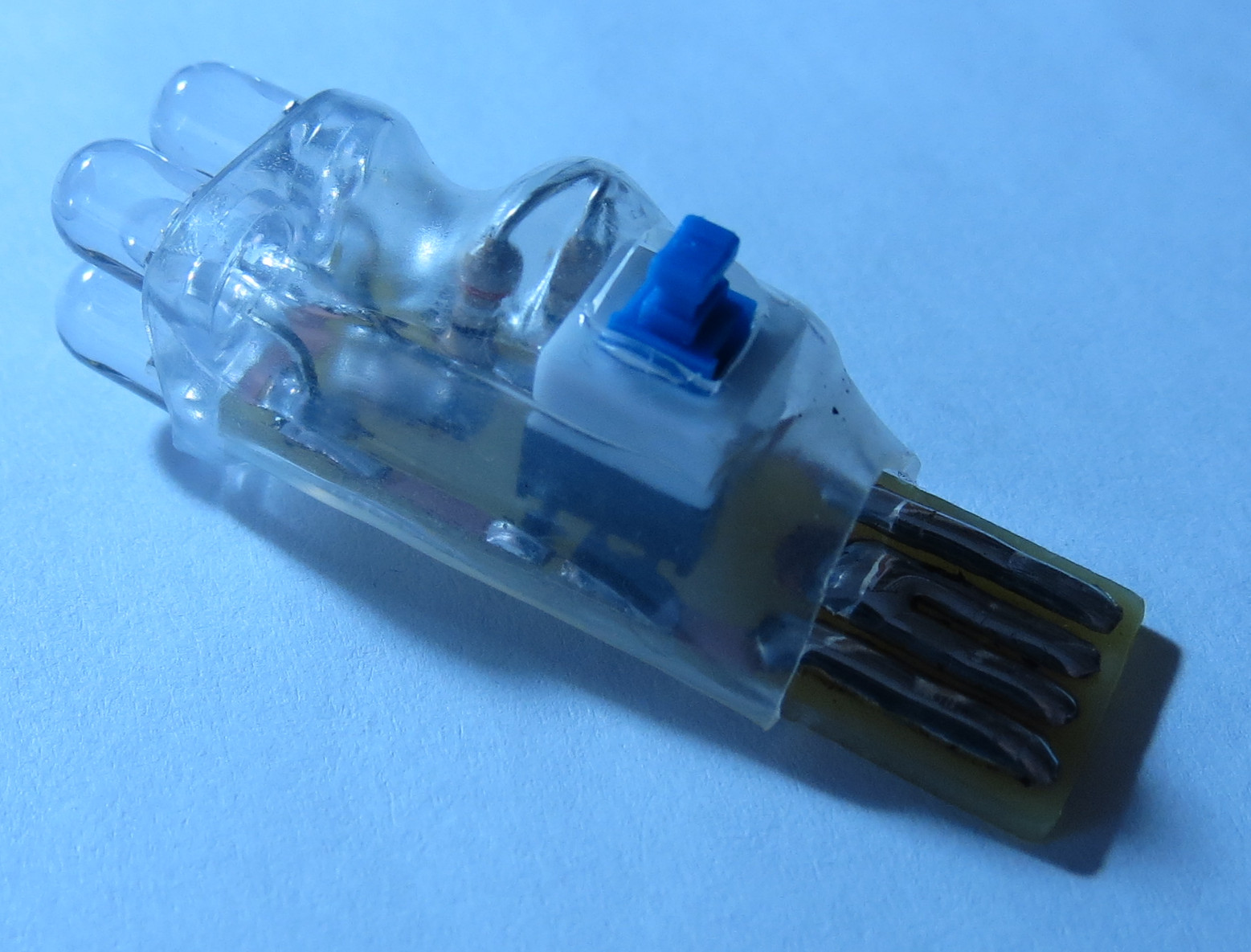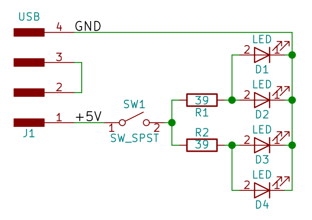 Como señalé anteriormente, el borde de la placa de circuito impreso sirve de conector, al que sigue un interruptor que entrega los 5 V de alimentación del USB a 2 resistencias, las cuales alimentan cada una a 2 leds en paralelo.