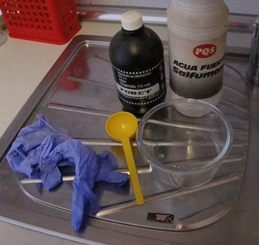 El siguiente paso es el atacado de la placa de cobre. Yo suelo utilizar la mezcla de agua fuerte (salfumán, ácido clorhídrico o HCl), agua oxigenada de 110 volúmenes y agua corriente. Las proporciones son 1:2:3 (agua, ácido y agua oxigenada, respectivamente).