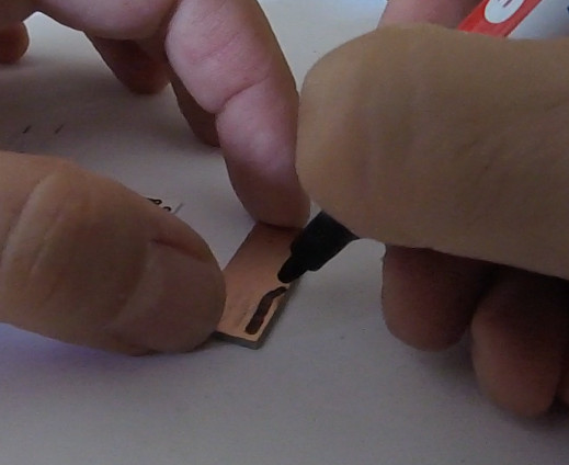 Yo elegí el rotulador indeleble para marcar las pistas en la cara de cobre, al ser una placa muy sencilla con pocas pistas. Para quien no sepa cómo es este método, lo explico a continuación.